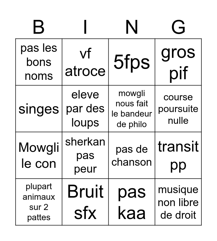 This bingo card has 16 words: Bruit sfx, transit pp, 5fps, pas les bons noms, Mowgli le con, vf atroce, pas de chanson, pas kaa, singes, eleve par des loups, plupart animaux sur 2 pattes, gros pif, sherkan pas peur, course poursuite nulle, mowgli nous fait le bandeur de philo and musique non libre de droit.