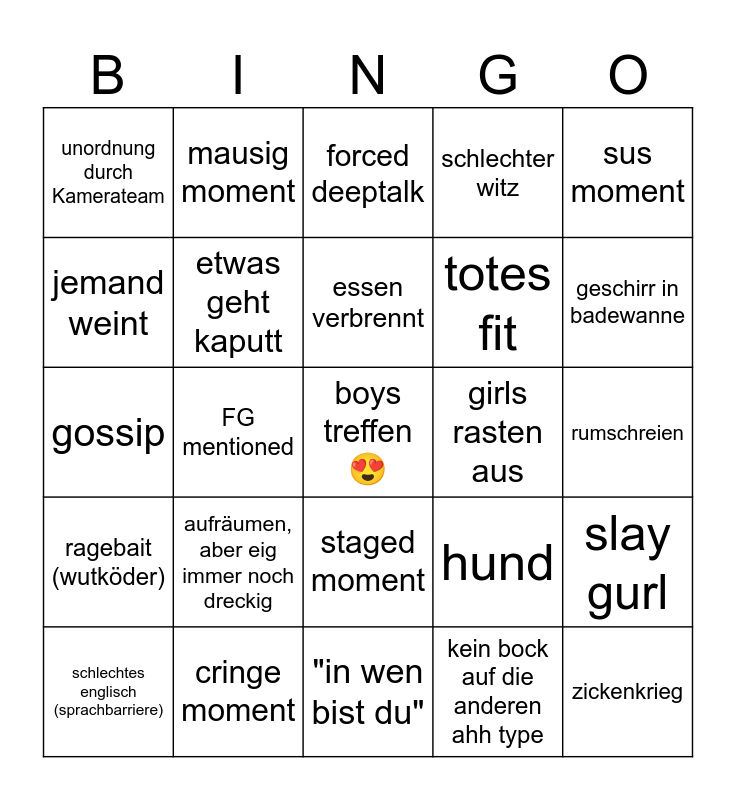 This bingo card has 25 words: ragebait (wutköder), cringe moment, boys treffen 😍, kein bock auf die anderen ahh type, sus moment, unordnung durch Kamerateam, mausig moment, forced deeptalk, girls rasten aus, slay gurl, jemand weint, etwas geht kaputt, "in wen bist du", hund, geschirr in badewanne, schlechtes englisch (sprachbarriere), FG mentioned, essen verbrennt, totes fit, rumschreien, gossip, aufräumen, aber eig immer noch dreckig, staged moment, schlechter witz and zickenkrieg.