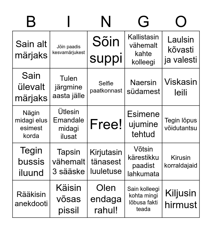 This bingo card has a free space and 24 words: Tapsin vähemalt 3 sääske, Käisin võsas pissil, Selfie paatkonnast, Rääkisin anekdooti, Laulsin kõvasti ja valesti, Sain alt märjaks, Sain ülevalt märjaks, Jõin paadis kesvamärjukest, Esimene ujumine tehtud, Kirjutasin tänasest luuletuse, Naersin südamest, Nägin midagi elus esimest korda, Võtsin kärestikku paadist lahkumata, Kirusin korraldajaid, Tulen järgmine aasta jälle, Sain kolleegi kohta mingi lõbusa fakti teada, Tegin lõpus võidutantsu, Sõin suppi, Viskasin leili, Ütlesin Emandale midagi ilusat, Kiljusin hirmust, Tegin bussis iluund, Kallistasin vähemalt kahte kolleegi and Olen endaga rahul!.
