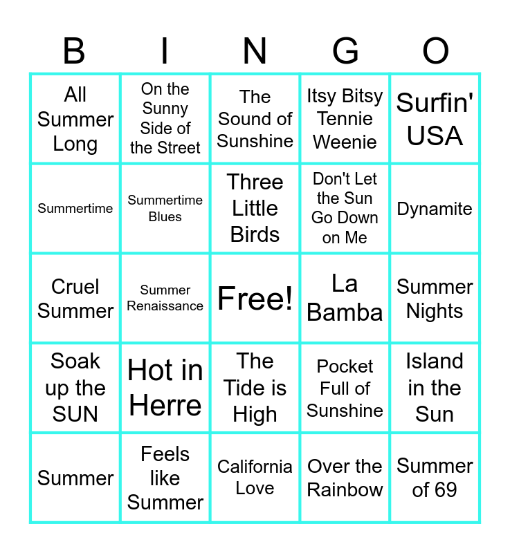 This bingo card has a free space and 34 words: Under The Sea, Over the Rainbow, Here Comes the SUN, Walking on Sunshine, Soak up the SUN, Summertime Blues, Surfin' USA, Summer, On the Sunny Side of the Street, Good Vibrations, Three Little Birds, The Sound of Sunshine, In SUMMER, Summer Evening, La Bamba, Dynamite, Feels like Summer, Cruel Summer, Hot in Herre, Pocket Full of Sunshine, The Tide is High, California Gurls, All Summer Long, Summer Nights, California Love, Summer of 69, Itsy Bitsy Tennie Weenie, Chicken Fried, Don't Let the Sun Go Down on Me, Summertime, Summer Love, Summer Renaissance, Island in the Sun and Summer Paradise.