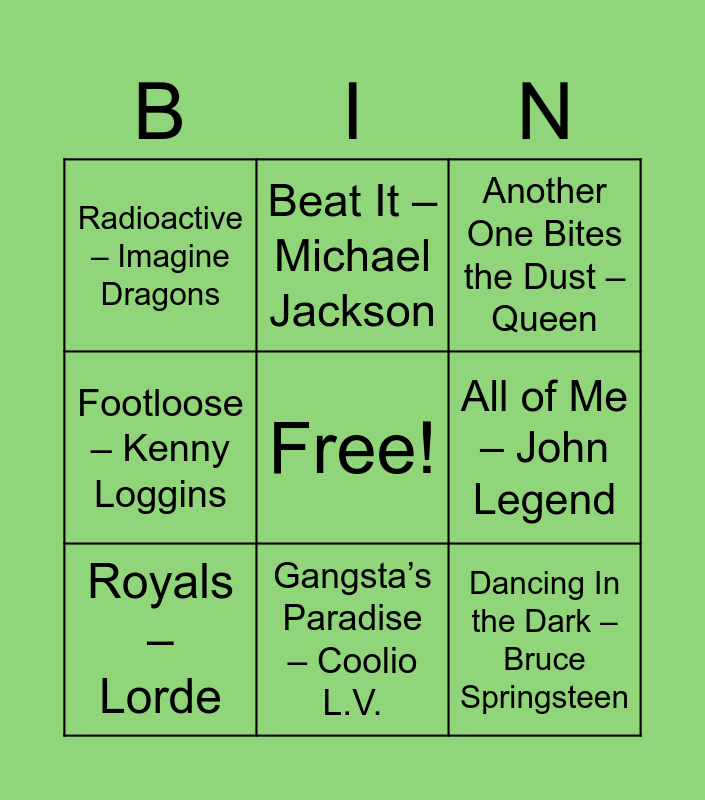 This bingo card has a free space and 15 words: Girls Just Want to Have Fun β Cyndi Lauper, I Wanna Dance with Somebody β Whitney Houston, Another One Bites the Dust β Queen, Radioactive β Imagine Dragons, Gangstaβs Paradise β Coolio L.V., Dancing In the Dark β Bruce Springsteen, Life Is a Highway β Rascal Flatts, Eye of the Tiger β Survivor, All of Me β John Legend, Just the Way You Are β Bruno Mars, Sweet Dreams (Are Made of These) β Eurythmics, Footloose β Kenny Loggins, Royals β Lorde, Beat It β Michael Jackson and Jump β Van Halen.