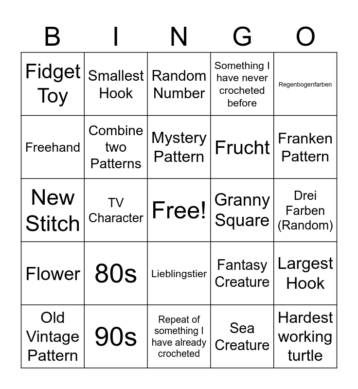 This bingo card has a free space and 24 words: 80s, 90s, Mystery Pattern, Old Vintage Pattern, Regenbogenfarben, Fidget Toy, Freehand, Smallest Hook, Granny Square, Lieblingstier, Frucht, New Stitch, Fantasy Creature, Largest Hook, Combine two Patterns, Sea Creature, Drei Farben (Random), Random Number, Franken Pattern, TV Character, Hardest working turtle, Flower, Something I have never crocheted before and Repeat of something I have already crocheted.