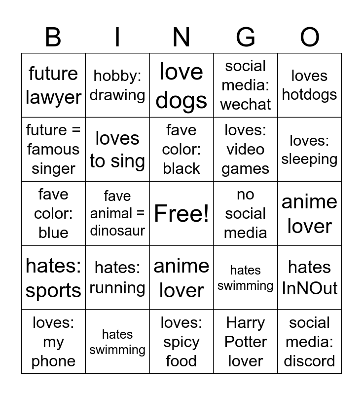 This bingo card has a free space and 28 words: hates InNOut, fave animal: cat, loves: video games, Harry Potter lover, future = famous singer, love dogs, hobby: drawing, hates: sports, no social media, loves: my phone, fave color: blue, social media: wechat, hates swimming, loves: spicy food, loves: sleeping, fave food: sushi, hates: running, loves to sing, fave color: black, anime lover, future lawyer, fave sport: basketball, social media: discord, fave animal = dinosaur, anime lover, hates swimming, loves hotdogs and fave animal = dinosaur.