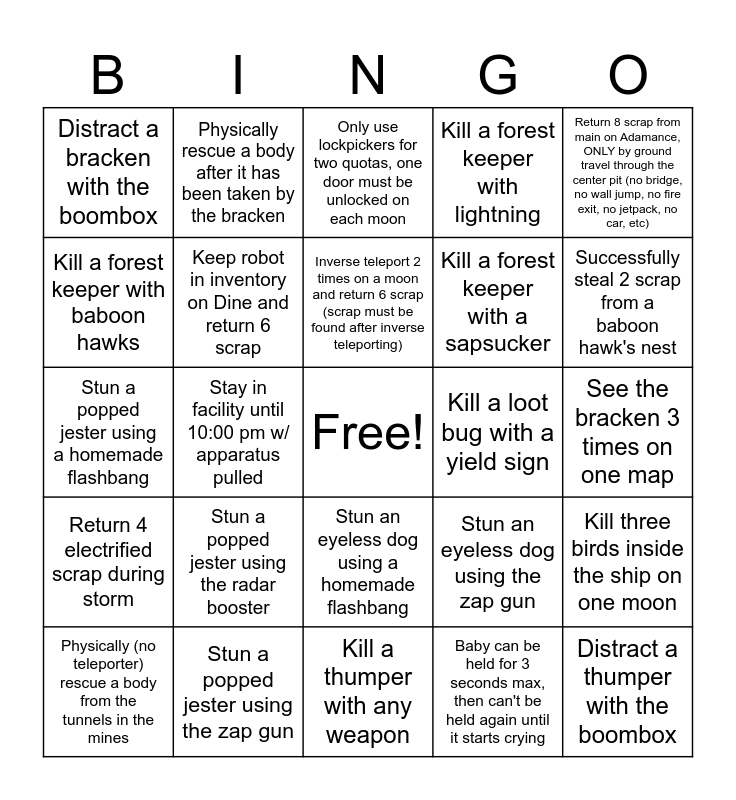 This bingo card has a free space and 33 words: Free space is meet first quota, Don’t enter ship until 11:00 pm, Stay in facility until 10:00 pm w/ apparatus pulled, Return 8 scrap during eclipse, Return 4 electrified scrap during storm, Keep robot in inventory on Dine and return 6 scrap, Return 8 scrap from main on Adamance, ONLY by ground travel through the center pit (no bridge, no wall jump, no fire exit, no jetpack, no car, etc), Physically (no teleporter) rescue a body from the tunnels in the mines, Physically rescue a body after it has been taken by the bracken, Inverse teleport 2 times on a moon and survive by escaping (no teleporting), Inverse teleport 2 times on a moon and return 6 scrap (scrap must be found after inverse teleporting), Only use lockpickers for two quotas, one door must be unlocked on each moon, Stay maxed out on TZP inhalant for the entirety of a moon and return two scrap, Successfully steal 2 scrap from a loot bug nest, Kill a loot bug with a yield sign, Successfully steal 2 scrap from a baboon hawk's nest, Stun a popped jester using the zap gun, Stun a popped jester using a homemade flashbang, Stun a popped jester using the radar booster, Stun an eyeless dog using the zap gun, Stun an eyeless dog using a homemade flashbang, Survive an eyeless dog in the ship, Distract a bracken with the boombox, See the bracken 3 times on one map, Kill a thumper with any weapon, Distract a thumper with the boombox, Kill a forest keeper with lightning, Kill a forest keeper with a sapsucker, Kill a forest keeper with baboon hawks, Kill three birds inside the ship on one moon, Bring baby outside and survive, Baby can be held for 3 seconds max, then can't be held again until it starts crying and Successfully steal an egg from a sapsucker.