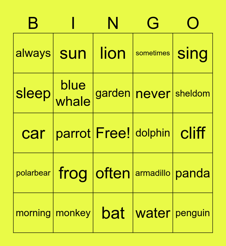 This bingo card has a free space and 24 words: frog, monkey, garden, morning, sing, always, sleep, sun, dolphin, often, never, car, armadillo, panda, blue whale, water, cliff, lion, sheldom, parrot, penguin, polarbear, sometimes and bat.