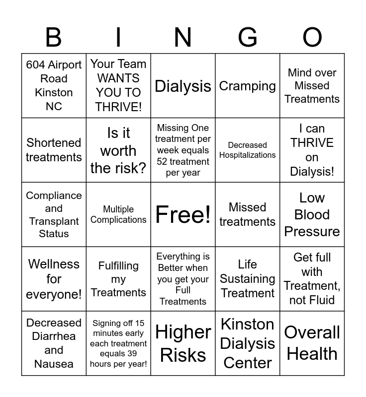 This bingo card has a free space and 24 words: Fulfilling my Treatments, Signing off 15 minutes early each treatment equals 39 hours per year!, Missing One treatment per week equals 52 treatment per year, Decreased Diarrhea and Nausea, Mind over Missed Treatments, 604 Airport Road Kinston NC, Shortened treatments, Your Team WANTS YOU TO THRIVE!, Missed treatments, Everything is Better when you get your Full Treatments, Decreased Hospitalizations, Compliance and Transplant Status, Life Sustaining Treatment, Get full with Treatment, not Fluid, Is it worth the risk?, Kinston Dialysis Center, Low Blood Pressure, Dialysis, I can THRIVE on Dialysis!, Multiple Complications, Overall Health, Wellness for everyone!, Cramping and Higher Risks.