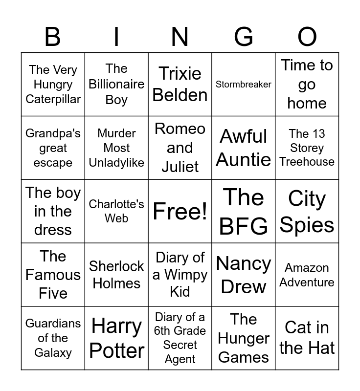 This bingo card has a free space and 30 words: Harry Potter, The Gruffalo, Charlotte's Web, Dogman, The Very Hungry Caterpillar, Trixie Belden, Murder Most Unladylike, Diary of a Wimpy Kid, The BFG, Diary of a 6th Grade Secret Agent, City Spies, Cat in the Hat, The Hunger Games, The Wild West Children, The 13 Storey Treehouse, Twilight, Nancy Drew, The Famous Five, Sherlock Holmes, Time to go home, The boy in the dress, The lion in the meadow, The Billionaire Boy, Awful Auntie, Grandpa's great escape, Stormbreaker, Amazon Adventure, Guardians of the Galaxy, Romeo and Juliet and Nine Girls.