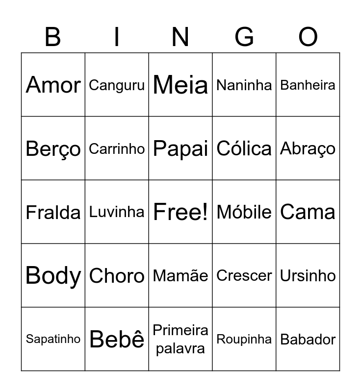 This bingo card has a free space and 40 words: Chupeta, Fralda, Mamadeira, Carrinho, Bebê, Mamãe, Papai, Lenço umedecido, Banheira, Body, Luvinha, Naninha, Babador, Cama, Móbile, Choro, Leite, Amor, Azul, Meia, Ursinho, Roupinha, Cólica, Berço, Chá do Emanuel, Aconchego, Pezinho, Soneca, Mamãe cansada, Hora do banho, Trocador, Sapatinho, Dentinho, Crescer, Abraço, Primeira palavra, Sorrisinho, Hora do mamá, Canguru and Mãe de menino.