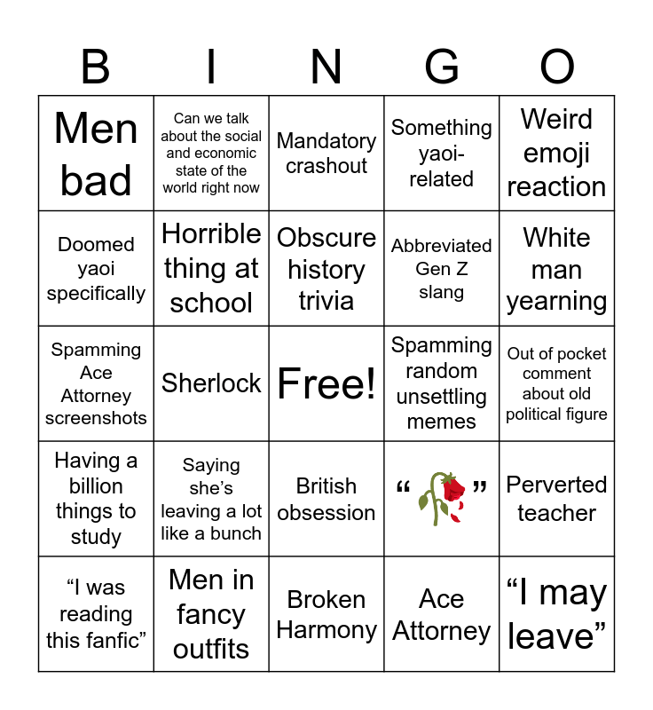 This bingo card has a free space and 24 words: Saying she’s leaving a lot like a bunch, Men in fancy outfits, Obscure history trivia, “I was reading this fanfic”, Weird emoji reaction, Men bad, Doomed yaoi specifically, Can we talk about the social and economic state of the world right now, Spamming random unsettling memes, British obsession, Abbreviated Gen Z slang, Spamming Ace Attorney screenshots, “🥀”, Perverted teacher, Horrible thing at school, Ace Attorney, Out of pocket comment about old political figure, Mandatory crashout, White man yearning, Sherlock, “I may leave”, Having a billion things to study, Something yaoi-related and Broken Harmony.
