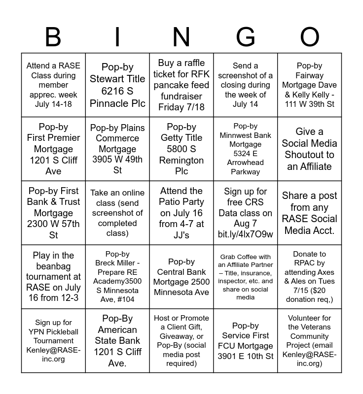 This bingo card has a free space and 24 words: Pop-by Breck Miller - Prepare RE Academy3500 S Minnesota Ave, #104, Pop-By American State Bank 1201 S Cliff Ave., Pop-by Getty Title 5800 S Remington Plc, Sign up for YPN Pickleball Tournament Kenley@RASE-inc.org, Pop-by Fairway Mortgage Dave & Kelly Kelly - 111 W 39th St, Attend a RASE Class during member apprec. week July 14-18, Pop-by First Premier Mortgage 1201 S Cliff Ave, Pop-by Stewart Title 6216 S Pinnacle Plc, Sign up for free CRS Data class on Aug 7 bit.ly/4lx7O9w, Pop-by Central Bank Mortgage 2500 Minnesota Ave, Pop-by Minnwest Bank Mortgage 5324 E Arrowhead Parkway, Pop-by First Bank & Trust Mortgage 2300 W 57th St, Grab Coffee with an Affiliate Partner – Title, insurance, inspector, etc. and share on social media, Donate to RPAC by attending Axes & Ales on Tues 7/15 ($20 donation req,), Pop-by Plains Commerce Mortgage 3905 W 49th St, Pop-by Service First FCU Mortgage 3901 E 10th St, Share a post from any RASE Social Media Acct., Buy a raffle ticket for RFK pancake feed fundraiser Friday 7/18, Give a Social Media Shoutout to an Affiliate, Take an online class (send screenshot of completed class), Volunteer for the Veterans Community Project (email Kenley@RASE-inc.org), Play in the beanbag tournament at RASE on July 16 from 12-3, Send a screenshot of a closing during the week of July 14 and Host or Promote a Client Gift, Giveaway, or Pop-By (social media post required).