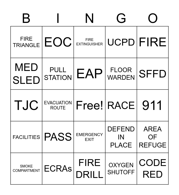 This bingo card has a free space and 24 words: SMOKE COMPARTMENT, PASS, EAP, OXYGEN SHUTOFF, FIRE, FIRE TRIANGLE, EOC, FIRE EXTINGUISHER, RACE, 911, TJC, PULL STATION, DEFEND IN PLACE, AREA OF REFUGE, MED SLED, ECRAs, FIRE DRILL, UCPD, SFFD, FACILITIES, EVACUATION ROUTE, EMERGENCY EXIT, FLOOR WARDEN and CODE RED.