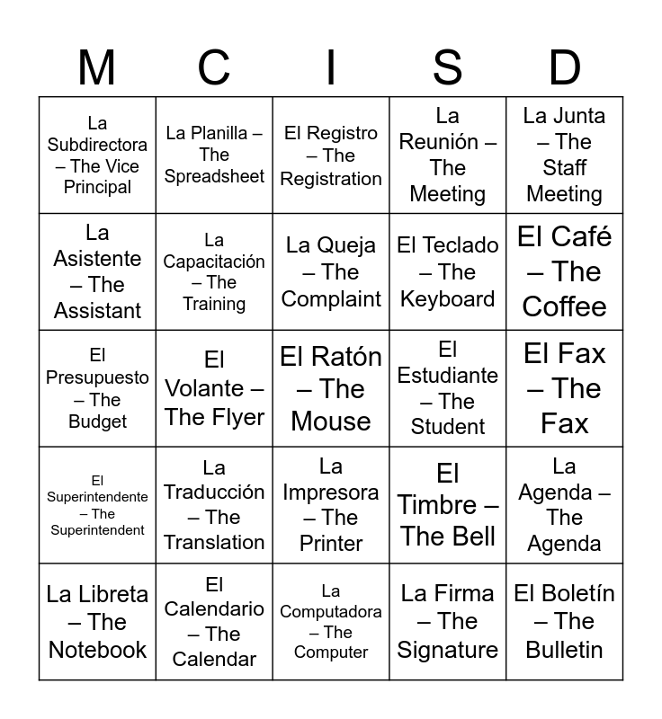 This bingo card has 54 words: La Secretaria – The Secretary, El Superintendente – The Superintendent, La Oficina – The Office, El Teléfono – The Telephone, La Impresora – The Printer, El Archivo – The File, La Reunión – The Meeting, El Memo – The Memo, La Asistente – The Assistant, El Director – The Principal, La Subdirectora – The Vice Principal, El Reporte – The Report, El Calendario – The Calendar, La Libreta – The Notebook, El Correo – The Mail, La Computadora – The Computer, El Ratón – The Mouse, El Teclado – The Keyboard, La Copiadora – The Copier, El Fax – The Fax, El Timbre – The Bell, La Maestra – The Teacher (female), El Estudiante – The Student, La Junta – The Staff Meeting, El Proyecto – The Project, La Planilla – The Spreadsheet, El Personal – The Staff, El Horario – The Schedule, El Despacho – The Office (private room), La Firma – The Signature, El Pase – The Pass, La Llamada – The Call, El Portal – The Portal, La Evaluación – The Evaluation, El Registro – The Registration, La Solicitud – The Application, El Presupuesto – The Budget, La Agenda – The Agenda, El Boletín – The Bulletin, La Capacitación – The Training, El Beneficio – The Benefit, La Nómina – The Payroll, El Permiso – The Permission, El Transporte – The Transportation, La Traducción – The Translation, La Inscripción – The Enrollment, El Departamento – The Department, La Ayuda – The Help, La Queja – The Complaint, El Volante – The Flyer, El Café – The Coffee, El Pupitre – The Desk, La Ventanilla – The Service Window and El Sello – The Stamp.