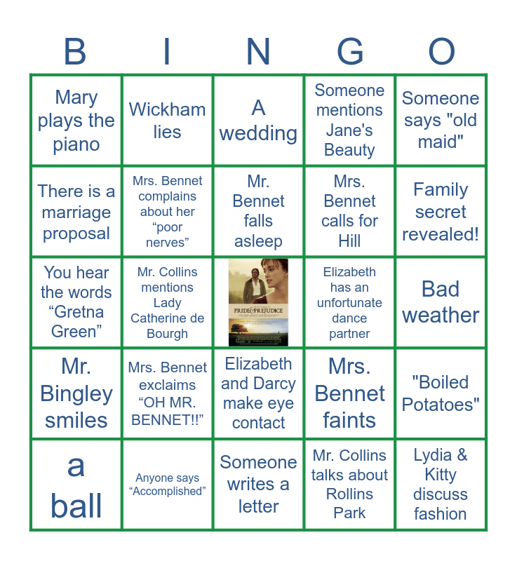 This bingo card has a free space and 24 words: Mrs. Bennet exclaims “OH MR. BENNET!!”, Anyone says “Accomplished”, Mr. Bennet falls asleep, a ball, Someone says "old maid", Mary plays the piano, There is a marriage proposal, Wickham lies, Elizabeth has an unfortunate dance partner, Elizabeth and Darcy make eye contact, Mrs. Bennet calls for Hill, You hear the words “Gretna Green”, Mrs. Bennet faints, "Boiled Potatoes", Mrs. Bennet complains about her “poor nerves”, Mr. Collins talks about Rollins Park, Bad weather, A wedding, Family secret revealed!, Mr. Collins mentions Lady Catherine de Bourgh, Lydia & Kitty discuss fashion, Mr. Bingley smiles, Someone mentions Jane's Beauty and Someone writes a letter.