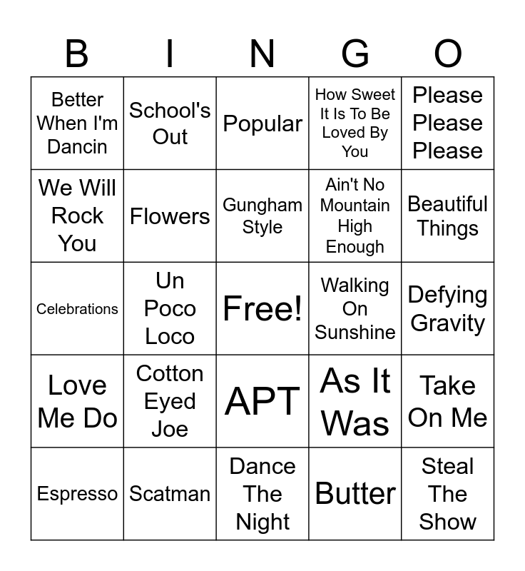 This bingo card has a free space and 24 words: Cotton Eyed Joe, Scatman, Gungham Style, Espresso, Please Please Please, Better When I'm Dancin, We Will Rock You, School's Out, Walking On Sunshine, APT, Ain't No Mountain High Enough, Celebrations, As It Was, Take On Me, Flowers, Butter, Defying Gravity, Popular, Beautiful Things, Un Poco Loco, Steal The Show, Love Me Do, How Sweet It Is To Be Loved By You and Dance The Night.