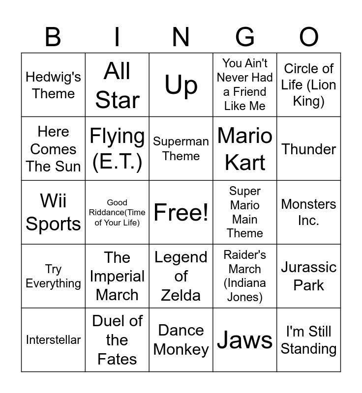 This bingo card has a free space and 24 words: The Imperial March, Duel of the Fates, Superman Theme, Interstellar, Circle of Life (Lion King), Hedwig's Theme, Here Comes The Sun, All Star, Super Mario Main Theme, Legend of Zelda, Mario Kart, Wii Sports, Raider's March (Indiana Jones), Jurassic Park, Flying (E.T.), Jaws, Monsters Inc., Up, Thunder, Good Riddance(Time of Your Life), I'm Still Standing, Try Everything, You Ain't Never Had a Friend Like Me and Dance Monkey.