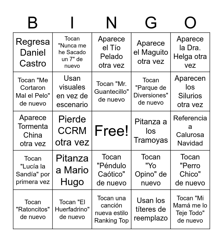 This bingo card has a free space and 24 words: Pitanza a Mario Hugo, Tocan "El Huerfadrino" de nuevo, Tocan "Mr. Guantecillo" de nuevo, Tocan "Ratoncitos" de nuevo, Aparece la Dra. Helga otra vez, Regresa Daniel Castro, Tocan "Me Cortaron Mal el Pelo" de nuevo, Tocan "Nunca me he Sacado un 7" de nuevo, Pitanza a los Tramoyas, Tocan "Péndulo Caótico" de nuevo, Tocan "Parque de Diversiones" de nuevo, Aparece Tormenta China otra vez, Tocan "Yo Opino" de nuevo, Tocan "Perro Chico" de nuevo, Usan visuales en vez de escenario, Usan los títeres de reemplazo, Referencia a Calurosa Navidad, Aparece el Tío Pelado otra vez, Aparecen los Silurios otra vez, Pierde CCRM otra vez, Tocan "Mi Mamá me lo Teje Todo" de nuevo, Tocan "Lucía la Sandía" por primera vez, Aparece el Maguito otra vez and Tocan una canción nueva estilo Ranking Top.