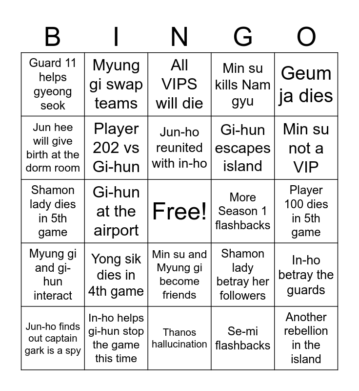 This bingo card has a free space and 24 words: Yong sik dies in 4th game, In-ho helps gi-hun stop the game this time, Jun-ho reunited with in-ho, Jun-ho finds out captain gark is a spy, Geum ja dies, Guard 11 helps gyeong seok, Jun hee will give birth at the dorm room, Myung gi swap teams, More Season 1 flashbacks, Min su and Myung gi become friends, Gi-hun escapes island, Shamon lady dies in 5th game, Shamon lady betray her followers, In-ho betray the guards, Player 202 vs Gi-hun, Se-mi flashbacks, Player 100 dies in 5th game, All VIPS will die, Min su not a VIP, Gi-hun at the airport, Another rebellion in the island, Myung gi and gi-hun interact, Min su kills Nam gyu and Thanos hallucination.