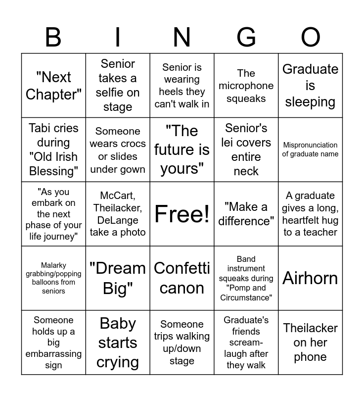 This bingo card has a free space and 27 words: Band instrument squeaks during "Pomp and Circumstance", Senior cries, Senior's lei covers entire neck, Someone trips walking up/down stage, Tabi cries during "Old Irish Blessing", Senior is wearing heels they can't walk in, Senior takes a selfie on stage, Malarky grabbing/popping balloons from seniors, "Make a difference", Airhorn, "As you embark on the next phase of your life journey", The microphone squeaks, Someone holds up a big embarrassing sign, Baby starts crying, Mispronunciation of graduate name, Graduate dabs or does a tiktok move, Someone wears crocs or slides under gown, "The future is yours", "Dream Big", "Next Chapter", A graduate gives a long, heartfelt hug to a teacher, Graduate's friends scream-laugh after they walk, McCart, Theilacker, DeLange take a photo, Theilacker on her phone, Confetti canon, Graduate is sleeping and Graduate is on their phone.
