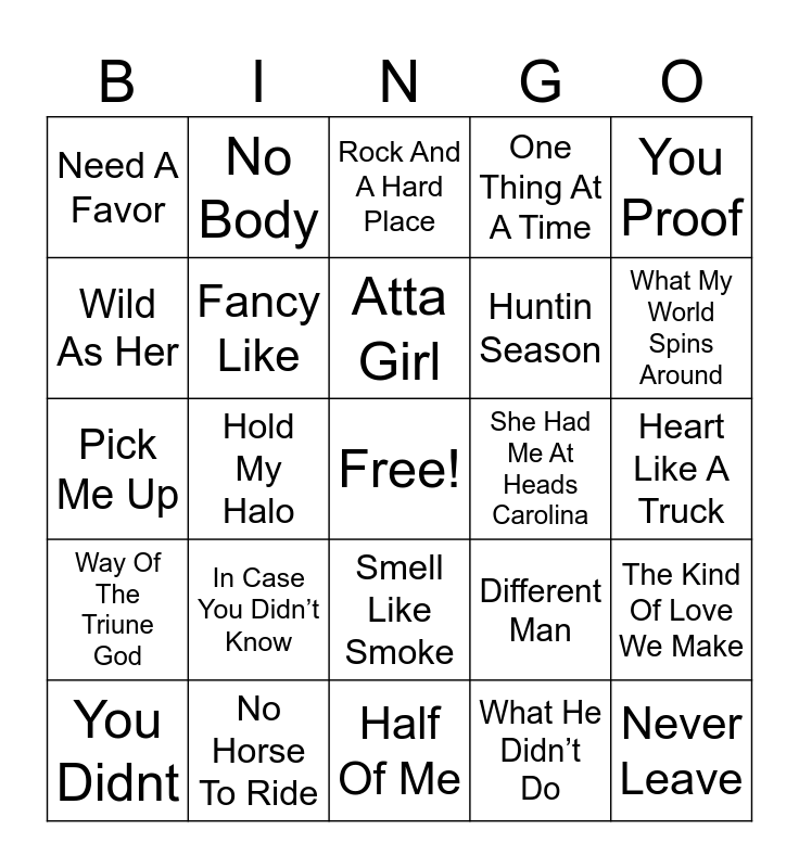 This bingo card has a free space and 70 words: wait in the truck, Heart Like A Truck, Watermelon Moonshine, Thank God, No Horse To Ride, Thought You Should Know, One Thing At A Time, Something In The Orange, You Proof, Tennessee Whiskey, The Kind Of Love We Make, Fall In Love, Need A Favor, Rock And A Hard Place, Going, Going, Going, Hold My Halo, Smell Like Smoke, Huntin Season, Til You Can’t, Way Of The Triune God, She Had Me At Heads Carolina, Different Man, What My World Spins Around, Mountain Song, Tennessee Orange, Wreckage, Things A Man Outta Know, The Good I’ll Do, What He Didn’t Do, Chasin You, No Body, Handle On You, Motorcycle Drive By, Tennessee Fan, Sand In My Boots, Next Thing You Know, Joy Of My Life, Country On, Christmas In Dixie, Wild As Her, All Your’n, In Case You Didn’t Know, Never Leave, FAFO, Five More Minutes, Fancy Like, You Didnt, Whiskey On You, it’s been a year, If Heaven Had A Landline, Whiskey Glasses, Dirty Looks, Weak-End, Love You Again, Half Of Me, 5 Foot 9, Atta Girl, Never Say Never, Don’t Come Lookin’, Soul, Pick Me Up, Buy Dirt, More Than My Hometown, Going, Going, Gone, I Still Love You, We Ride, down home, Beer With My Friends, Forever After All and Over For You.