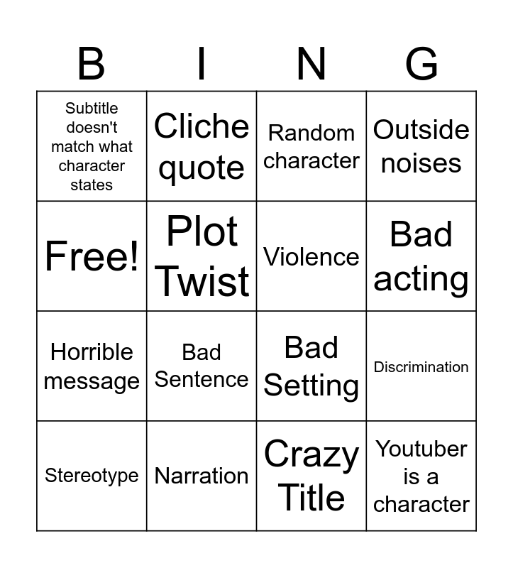 This bingo card has 16 words: Narration, Discrimination, Random character, Subtitle doesn't match what character states, Horrible message, Cliche quote, Bad Setting, Crazy Title, Free!, Plot Twist, Stereotype, Outside noises, Bad Sentence, Bad acting, Violence and Youtuber is a character.