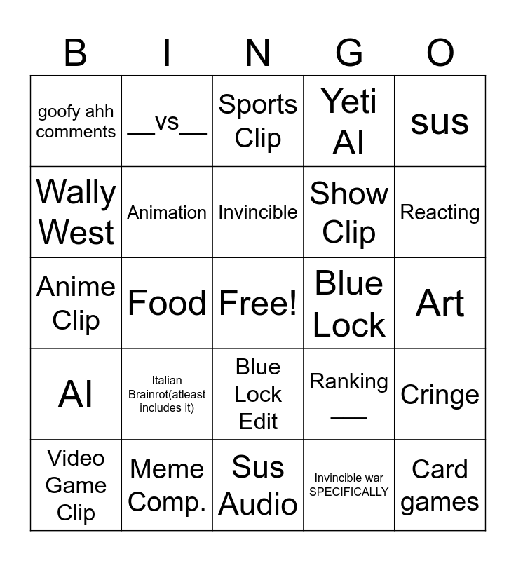 This bingo card has a free space and 24 words: Italian Brainrot(atleast includes it), Meme Comp., Invincible, Video Game Clip, sus, goofy ahh comments, Wally West, __vs__, Blue Lock, Blue Lock Edit, Show Clip, Anime Clip, Ranking ___, Cringe, Animation, Invincible war SPECIFICALLY, Art, Sports Clip, Reacting, Food, Card games, AI, Yeti AI and Sus Audio.
