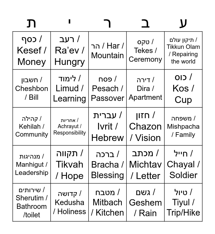 This bingo card has 40 words: תפילה / Tefilah / Prayer, קהילה / Kehilah / Community, צדקה / Tzedakah / Charity, לימוד / Limud / Learning, קדושה / Kedusha / Holiness, ברכה / Bracha / Blessing, פסח / Pesach / Passover, אמונה / Emunah / Faith, תיקון עולם / Tikkun Olam / Repairing the world, מנהיגות / Manhigut / Leadership, אחריות / Achrayut / Responsibility, טקס / Tekes / Ceremony, עברית / Ivrit / Hebrew, משפחה / Mishpacha / Family, חזון / Chazon / Vision, תקווה / Tikvah / Hope, תחנה / Tachana / Station, כסף / Kesef / Money, טעים / Ta’im / Tasty, הר / Har / Mountain, חייל / Chayal / Soldier, גשם / Geshem / Rain, דירה / Dira / Apartment, חשבון / Cheshbon / Bill, אוכל / Ochel / Food, פלאפון / Pelefon / Mobile phone, לחם / Lechem / Bread, עוגה / Uga / Cake, טיול / Tiyul / Trip/Hike, עיפרון / Iparon / Pencil, מקלחת / Miklachat / Shower, שירותים / Sherutim / Bathroom /toilet, שם / Shem / Name, מכתב / Michtav / Letter, כוס / Kos / Cup, מטבח / Mitbach / Kitchen, בית / Bayit / House, זמן / Zman / Time, רעב / Ra’ev / Hungry and אתמול / Etmol / Yesterday.