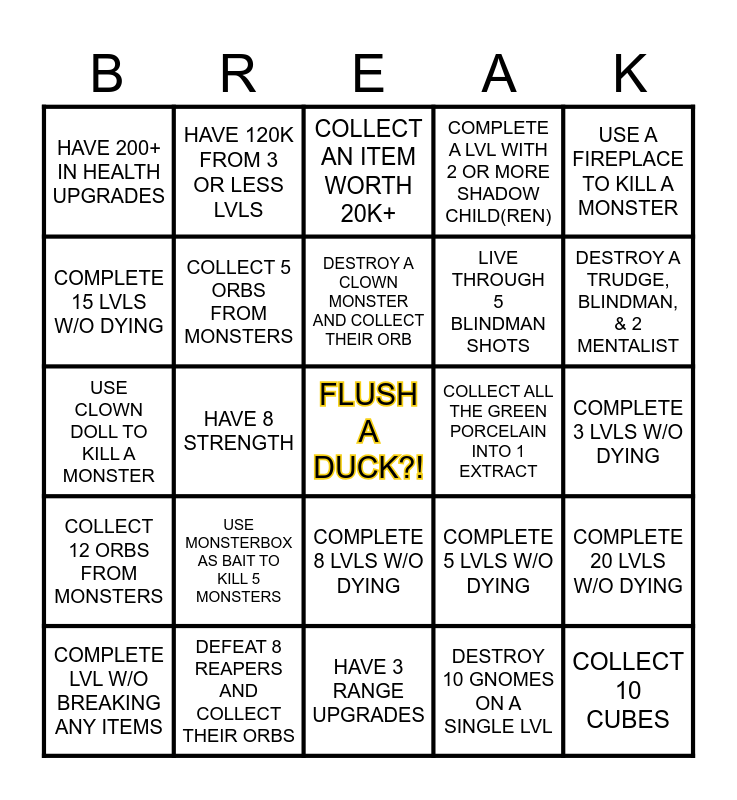 This bingo card has a free space and 29 words: COMPLETE LVL W/O BREAKING ANY ITEMS, USE A BANGER TO KILL ANOTHER MONSTER, HAVE 8 STRENGTH, COMPLETE A LVL IN UNDER 5 MINS, HAVE 200+ IN HEALTH UPGRADES, COLLECT AN ITEM WORTH 20K+, COLLECT 5 ORBS FROM MONSTERS, USE MONSTERBOX AS BAIT TO KILL 5 MONSTERS, COLLECT ALL THE GREEN PORCELAIN INTO 1 EXTRACT, DEFEAT 8 REAPERS AND COLLECT THEIR ORBS, COMPLETE 3 LVLS W/O DYING, COLLECT 10 CUBES, HAVE 3 RANGE UPGRADES, DESTROY 10 GNOMES ON A SINGLE LVL, DESTROY A TRUDGE, BLINDMAN, & 2 MENTALIST, HAVE 90K+ FROM A SINGLE LVL, COMPLETE 8 LVLS W/O DYING, COLLECT 12 ORBS FROM MONSTERS, USE A FIREPLACE TO KILL A MONSTER, USE CLOWN DOLL TO KILL A MONSTER, COMPLETE 5 LVLS W/O DYING, HAVE 200 IN STAMINA, LIVE THROUGH 5 BLINDMAN SHOTS, COMPLETE 15 LVLS W/O DYING, COMPLETE A LVL WITH 2 OR MORE SHADOW CHILD(REN), HAVE 120K FROM 3 OR LESS LVLS, COMPLETE 20 LVLS W/O DYING, DESTROY A CLOWN MONSTER AND COLLECT THEIR ORB and KILL 2 HEADSMAN.