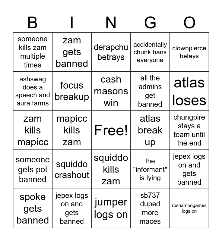 This bingo card has a free space and 24 words: spoke gets banned, squiddo crashout, cash masons win, sb737 duped more maces, clownpierce betays, someone kills zam multiple times, zam gets banned, derapchu betrays, atlas break up, chungpire stays a team until the end, zam kills mapicc, focus breakup, the "informant" is lying, jepex logs on and gets banned, ashswag does a speech and aura farms, jepex logs on and gets banned, jumper logs on, accidentally chunk bans everyone, atlas loses, someone gets pot banned, mapicc kills zam, squiddo kills zam, all the admins get banned and roshambogames logs on.