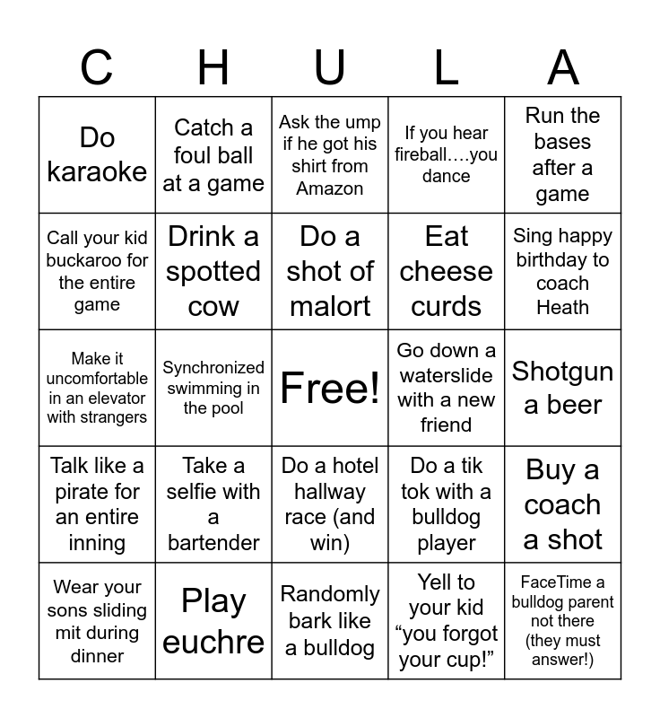 This bingo card has a free space and 24 words: Take a selfie with a bartender, Play euchre, Do a shot of malort, Wear your sons sliding mit during dinner, Run the bases after a game, Do karaoke, Call your kid buckaroo for the entire game, Catch a foul ball at a game, Go down a waterslide with a new friend, Do a hotel hallway race (and win), Eat cheese curds, Make it uncomfortable in an elevator with strangers, Do a tik tok with a bulldog player, Buy a coach a shot, Drink a spotted cow, Yell to your kid “you forgot your cup!”, Shotgun a beer, Ask the ump if he got his shirt from Amazon, Sing happy birthday to coach Heath, Synchronized swimming in the pool, FaceTime a bulldog parent not there (they must answer!), Talk like a pirate for an entire inning, If you hear fireball….you dance and Randomly bark like a bulldog.