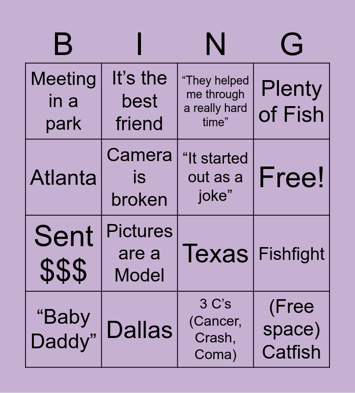This bingo card has 17 words: 3 C’s (Cancer, Crash, Coma), “Baby Daddy”, “They helped me through a really hard time”, Meeting in a park, Pictures are a Model, Plenty of Fish, Fishfight, “It started out as a joke”, Free!, Camera is broken, Dallas, Texas, Atlanta, It’s the best friend, Sent $$$, The pic was fake but everything else is real and (Free space) Catfish.