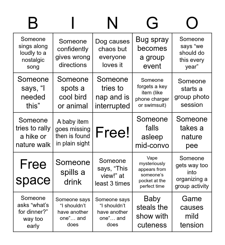 This bingo card has a free space and 28 words: Someone gets way too into organizing a group activity, Someone shares an embarrassing childhood story, Someone forgets a key item (like phone charger or swimsuit), Baby steals the show with cuteness, Someone says, “I needed this”, Dog causes chaos but everyone loves it, Someone confidently gives wrong directions, Free space, Someone falls asleep mid-convo, Someone asks “what’s for dinner?” way too early, Someone tries to rally a hike or nature walk, Bug spray becomes a group event, Someone says “I shouldn’t have another one”… and does, Someone says “I shouldn’t have another one”… and does, Someone starts a group photo session, Someone gets competitive about a game, Someone spills a drink, Someone spots a cool bird or animal, Someone tries to nap and is interrupted, Someone says, “This view!” at least 3 times, Someone sings along loudly to a nostalgic song, Dog refuses to come inside, Game causes mild tension, A baby item goes missing then is found in plain sight, Someone takes a nature pee, Vape mysteriously appears from someone’s pocket at the perfect time, Someone says “we should do this every year” and Someone pours a “just a splash” that’s half the cup.
