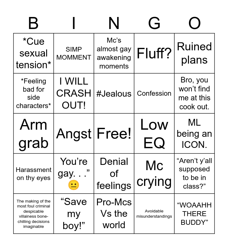This bingo card has a free space and 26 words: Denial of feelings, Avoidable misunderstandings, #Jealous, “Save my boy!”, Ruined plans, *Cue sexual tension*, *Feeling bad for side characters*, SIMP MOMMENT, ML being an ICON., Mc crying, Confession, Arm grab, “Aren’t y’all supposed to be in class?”, The making of the most foul criminal despicable villainess bone-chilling decisions imaginable, Angst, *Forgets human decency*, Fluff?, Harassment on thy eyes, Mc’s almost gay awakening moments, “WOAAHH THERE BUDDY”, Bro, you won’t find me at this cook out., Pro-Mcs Vs the world, Low EQ, You’re gay. . .” 😐, I WILL CRASH OUT! and 😐.