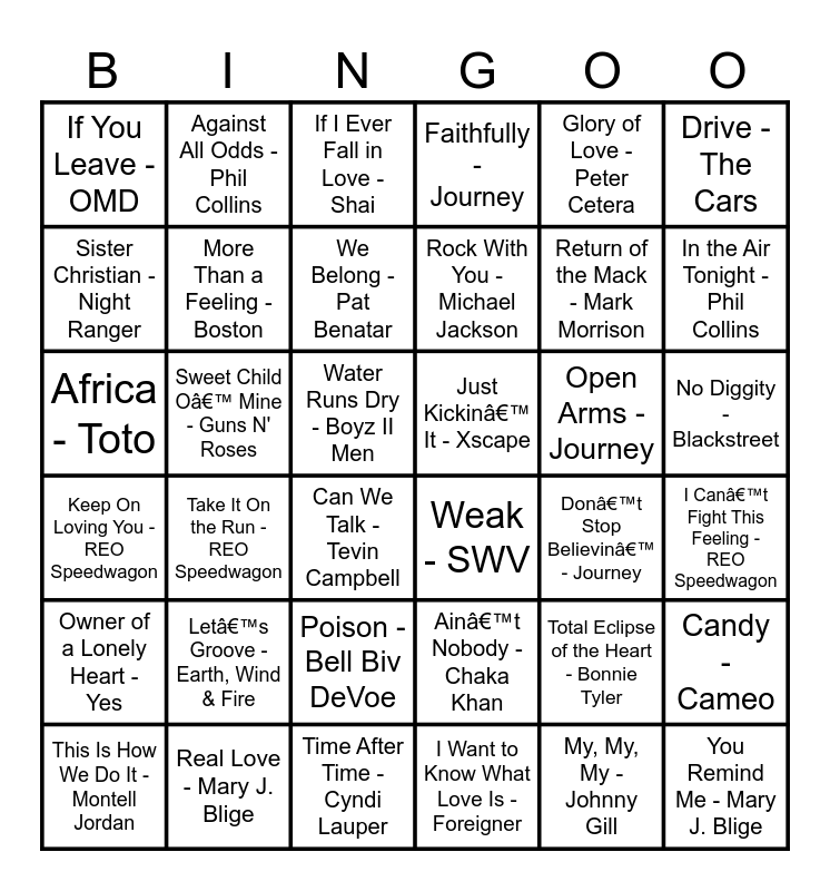 This bingo card has 51 words: Free!, Africa - Toto, Every Breath You Take - The Police, Don’t Stop Believin’ - Journey, Open Arms - Journey, Time After Time - Cyndi Lauper, Against All Odds - Phil Collins, With or Without You - U2, Drive - The Cars, I Want to Know What Love Is - Foreigner, Sister Christian - Night Ranger, Faithfully - Journey, Take It On the Run - REO Speedwagon, Keep On Loving You - REO Speedwagon, Rosanna - Toto, Total Eclipse of the Heart - Bonnie Tyler, More Than a Feeling - Boston, Sweet Child O’ Mine - Guns N' Roses, Hold the Line - Toto, Glory of Love - Peter Cetera, In the Air Tonight - Phil Collins, I Can’t Fight This Feeling - REO Speedwagon, If You Leave - OMD, We Belong - Pat Benatar, When I See You Smile - Bad English, Owner of a Lonely Heart - Yes, Rock With You - Michael Jackson, Before I Let Go - Maze ft. Frankie Beverly, Can We Talk - Tevin Campbell, If I Ever Fall in Love - Shai, Outstanding - The Gap Band, Candy - Cameo, Let’s Chill - Guy, I Wanna Be Down - Brandy, Real Love - Mary J. Blige, Weak - SWV, Poison - Bell Biv DeVoe, My, My, My - Johnny Gill, You Remind Me - Mary J. Blige, Anniversary - Tony! Toni! Toné!, Water Runs Dry - Boyz II Men, Just Kickin’ It - Xscape, Don’t Be Cruel - Bobby Brown, Every Little Step - Bobby Brown, Let’s Groove - Earth, Wind & Fire, Ain’t Nobody - Chaka Khan, Return of the Mack - Mark Morrison, This Is How We Do It - Montell Jordan, Creep - TLC, No Diggity - Blackstreet and Never Too Much - Luther Vandross.
