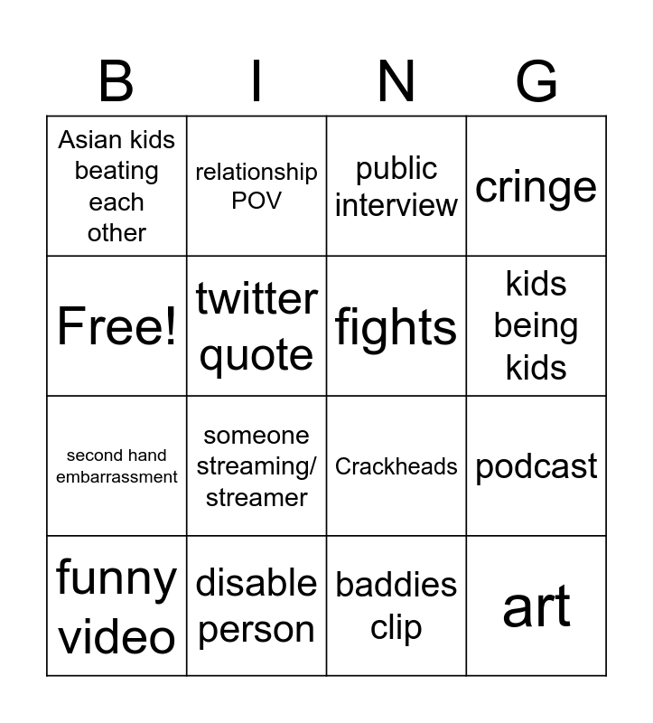 This bingo card has 16 words: disable person, podcast, public interview, Asian kids beating each other, second hand embarrassment, relationship POV, Crackheads, baddies clip, Free!, twitter quote, funny video, cringe, someone streaming/ streamer, kids being kids, fights and art.