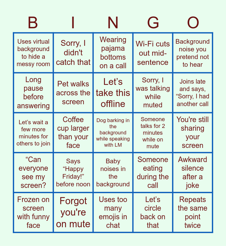 This bingo card has 25 words: “Can everyone see my screen?, Forgot you're on mute, Dog barking in the background while speaking with LM, Let’s circle back on that, Background noise you pretend not to hear, Uses virtual background to hide a messy room, Sorry, I didn't catch that, Wearing pajama bottoms on a call, Someone talks for 2 minutes while on mute, Awkward silence after a joke, Long pause before answering, Pet walks across the screen, Uses too many emojis in chat, Someone eating during the call, Joins late and says, “Sorry, I had another call, Frozen on screen with funny face, Coffee cup larger than your face, Let’s take this offline, Sorry, I was talking while muted, You're still sharing your screen, Let’s wait a few more minutes for others to join, Says “Happy Friday!” before noon, Baby noises in the background, Wi-Fi cuts out mid-sentence and Repeats the same point twice.
