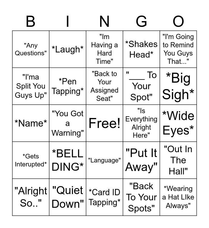 This bingo card has a free space and 24 words: *BELL DING*, "Quiet Down", "Back to Your Assigned Seat", "Alright So..", "I'm Going to Remind You Guys That...", "Any Questions", "I'ma Split You Guys Up", *Laugh*, "Is Everything Alright Here", "Language", "___ To Your Spot", *Name*, "Put It Away", "Out In The Hall", *Pen Tapping*, "Back To Your Spots", *Wide Eyes*, "Im Having a Hard Time", *Big Sigh*, "You Got a Warning", *Wearing a Hat LIke Always", *Gets Interupted*, *Shakes Head* and *Card ID Tapping*.