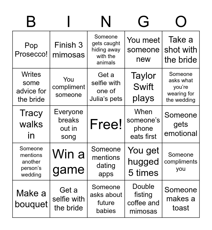 This bingo card has a free space and 24 words: Win a game, Get a selfie with the bride, Get a selfie with one of Julia’s pets, Make a bouquet, Take a shot with the bride, Pop Prosecco!, Writes some advice for the bride, Finish 3 mimosas, When someone’s phone eats first, Someone mentions dating apps, Taylor Swift plays, Tracy walks in, You get hugged 5 times, Someone compliments you, You compliment someone, Double fisting coffee and mimosas, Someone gets emotional, Someone gets caught hiding away with the animals, Someone asks what you’re wearing for the wedding, Everyone breaks out in song, Someone makes a toast, Someone mentions another person’s wedding, You meet someone new and Someone asks about future babies.