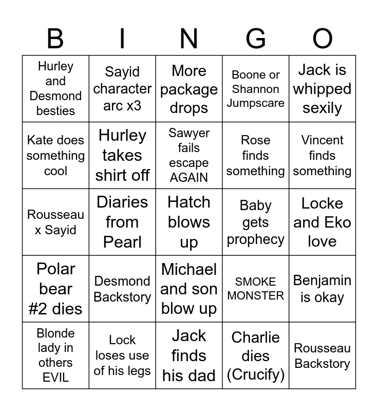 This bingo card has a free space and 24 words: Desmond Backstory, Lock loses use of his legs, Sawyer fails escape AGAIN, Blonde lady in others EVIL, Jack is whipped sexily, Hurley and Desmond besties, Kate does something cool, Sayid character arc x3, Baby gets prophecy, Michael and son blow up, Rose finds something, Rousseau x Sayid, SMOKE MONSTER, Benjamin is okay, Hurley takes shirt off, Charlie dies (Crucify), Locke and Eko love, More package drops, Vincent finds something, Diaries from Pearl, Rousseau Backstory, Polar bear #2 dies, Boone or Shannon Jumpscare and Jack finds his dad.