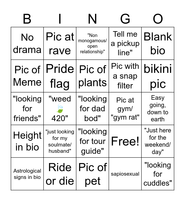 This bingo card has 25 words: "just looking for my soulmate/ husband", Pic of pet, Pic of plants, Astrological signs in bio, Blank bio, No drama, Pic of Meme, Pic at rave, Pic at gym/ "gym rat", "looking for tour guide", Pic with a snap filter, "looking for friends", Free!, "Just here for the weekend/ day", Pride flag, "looking for cuddles", Easy going, down to earth, "Non monogamous/ open relationship", bikini pic, "weed 🍃 420", "looking for dad bod", Ride or die, Height in bio, Tell me a pickup line" and sapiosexual.