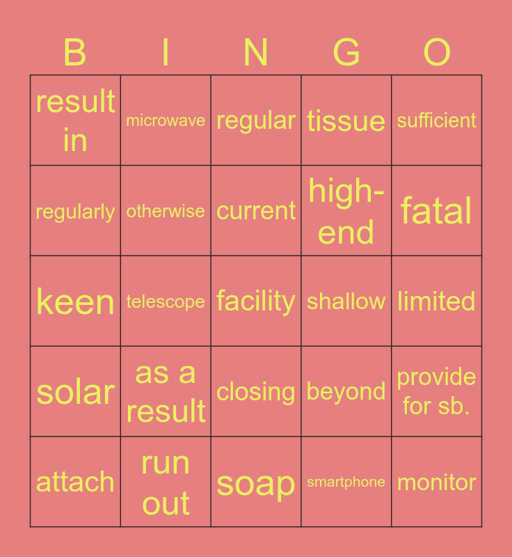 This bingo card has a free space and 36 words: recycle, muscle, lack, otherwise, beyond, solar, current, figure out, sufficient, towel, telescope, tissue, globe, shallow, fatal, result in, pattern, as a result, monitor, regular, limited, provide for sb., run out, attach, soap, microwave, keen, analysis, high-end, regularly, foam, pillow, smartphone, closing, mystery and in closing.