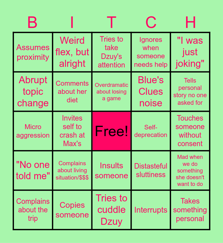 This bingo card has a free space and 24 words: Complains about living situation/$$$, Copies someone, Overdramatic about losing a game, Complains about the trip, "I was just joking", Assumes proximity, Abrupt topic change, Weird flex, but alright, Self-deprecation, Insults someone, Blue's Clues noise, Micro aggression, Distasteful sluttiness, Mad when we do something she doesn't want to do, Comments about her diet, Interrupts, Touches someone without consent, Tries to take Dzuy's attention, Tells personal story no one asked for, Invites self to crash at Max's, Takes something personal, "No one told me", Ignores when someone needs help and Tries to cuddle Dzuy.