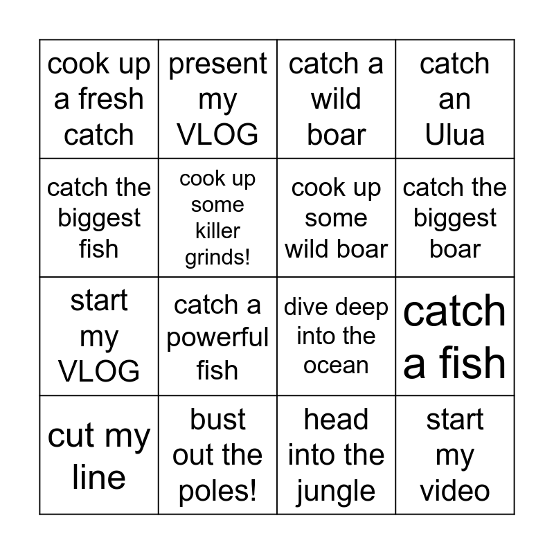 This bingo card has 16 words: bust out the poles!, catch a fish, catch a wild boar, cook up a fresh catch, start my VLOG, present my VLOG, dive deep into the ocean, head into the jungle, catch the biggest fish, cook up some killer grinds!, cut my line, catch an Ulua, catch a powerful fish, catch the biggest boar, cook up some wild boar and start my video.