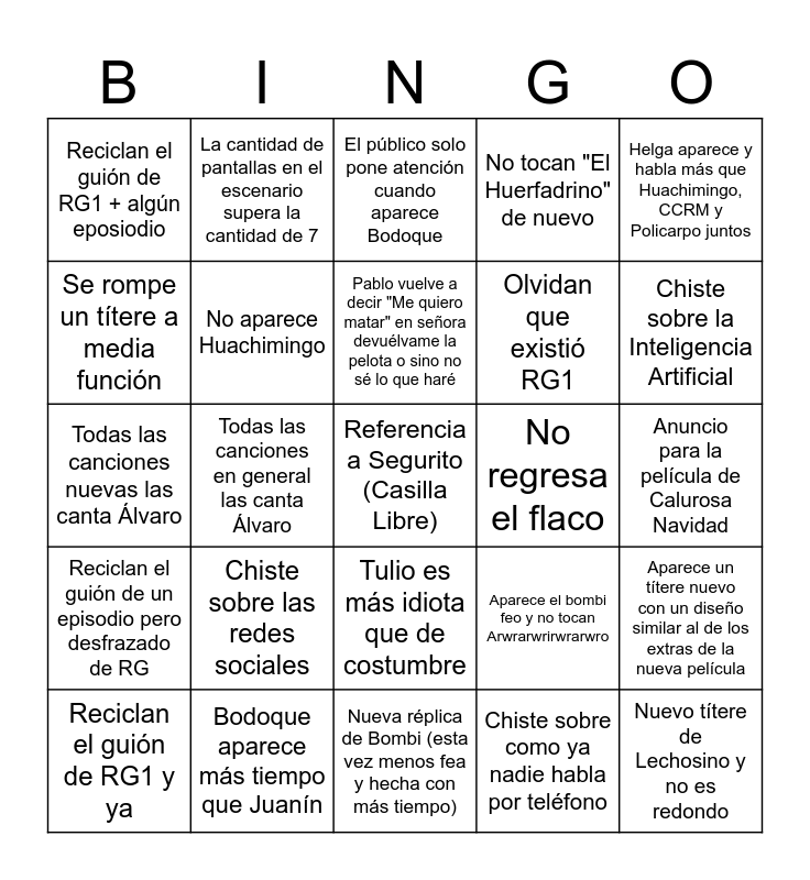 This bingo card has a free space and 24 words: Chiste sobre las redes sociales, Bodoque aparece más tiempo que Juanín, Pablo vuelve a decir "Me quiero matar" en señora devuélvame la pelota o sino no sé lo que haré, Reciclan el guión de RG1 y ya, Helga aparece y habla más que Huachimingo, CCRM y Policarpo juntos, Reciclan el guión de RG1 + algún eposiodio, Se rompe un títere a media función, La cantidad de pantallas en el escenario supera la cantidad de 7, No regresa el flaco, Tulio es más idiota que de costumbre, Olvidan que existió RG1, Todas las canciones nuevas las canta Álvaro, Aparece el bombi feo y no tocan Arwrarwrirwrarwro, Aparece un títere nuevo con un diseño similar al de los extras de la nueva película, No aparece Huachimingo, Chiste sobre como ya nadie habla por teléfono, Anuncio para la película de Calurosa Navidad, El público solo pone atención cuando aparece Bodoque, Chiste sobre la Inteligencia Artificial, Todas las canciones en general las canta Álvaro, Nuevo títere de Lechosino y no es redondo, Reciclan el guión de un episodio pero desfrazado de RG, No tocan "El Huerfadrino" de nuevo and Nueva réplica de Bombi (esta vez menos fea y hecha con más tiempo).