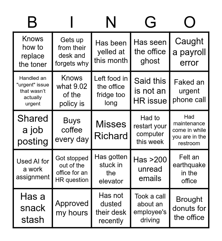 This bingo card has a free space and 29 words: Has a snack stash, Explained the difference between deduction and benefit, Buys coffee every day, Has <20 unread emails, Knows how to replace the toner, Has been yelled at this month, Knows what 9.02 of the policy is, Got stopped out of the office for an HR question, Had to restart your computer this week, Approved my hours, Had maintenance come in while you are in the restroom, Brought donuts for the office, Has not dusted their desk recently, Took a call about an employee's driving, Faked an urgent phone call, Talked someone off the FMLA cliff, Has gotten stuck in the elevator, Used AI for a work assignment, Caught a payroll error, Shared a job posting, Has >200 unread emails, Shared a meme about HR with a coworker, Said this is not an HR issue, Handled an "urgent" issue that wasn’t actually urgent, Has seen the office ghost, Gets up from their desk and forgets why, Felt an earthquake in the office, Left food in the office fridge too long and Had the hallway lights turned off on them.