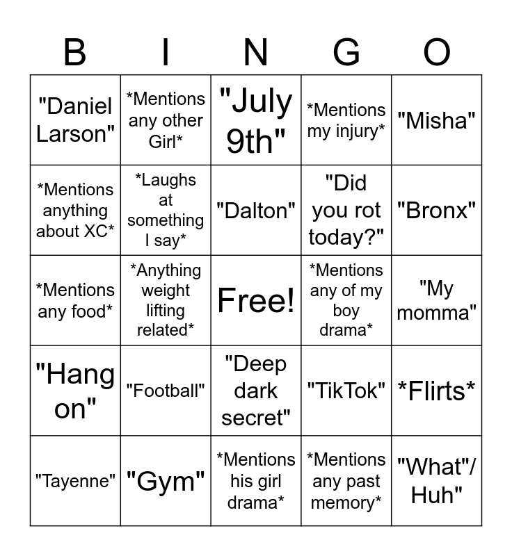 This bingo card has a free space and 24 words: "Football", "Gym", "Dalton", "Tayenne", "Misha", "Daniel Larson", *Mentions anything about XC*, *Mentions any other Girl*, *Mentions any of my boy drama*, "Deep dark secret", "Did you rot today?", *Mentions any food*, "TikTok", *Flirts*, *Laughs at something I say*, *Mentions any past memory*, "My momma", "July 9th", "Bronx", *Anything weight lifting related*, "What"/ Huh", "Hang on", *Mentions my injury* and *Mentions his girl drama*.