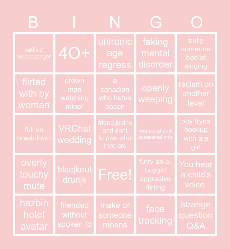 This bingo card has 26 words: Free!, face tracking, a canadian who hates bacon, friended without spoken to, bully someone bad at singing, catfish/ voicechanger, flirted with by woman, 4O+, boy tryna hookup with a e girl, furry an e-boygirl aggresive flirting, openly weeping, full on breakdown, You hear a child's voice., hazbin hotel avatar, VRChat wedding, e couple breaking up, faking mental disorder, overly touchy mute, unironic age regress, friend jkoins and dont knpwo who thye are, racism on another level, make or someone moans, reenact ghandi assassination's, blacjkout drunjk, grown man watching minor and strange question Q&A.
