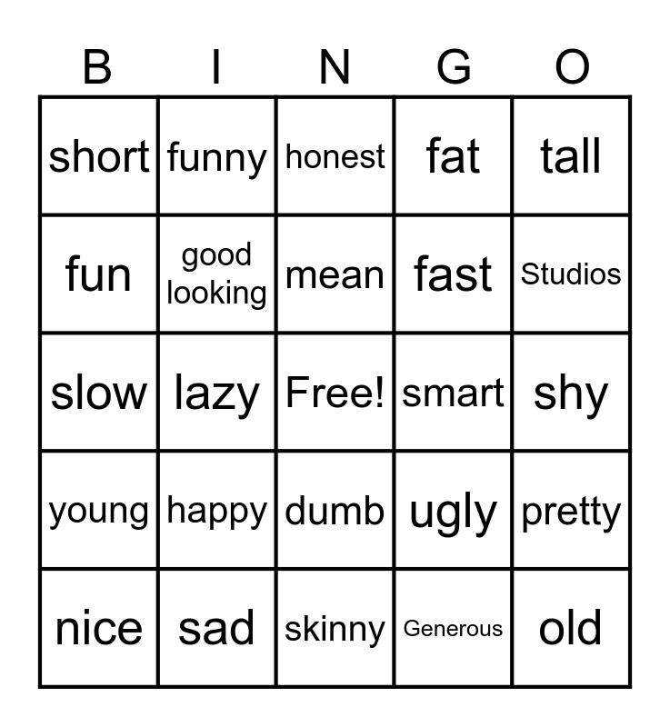 This bingo card has a free space and 24 words: happy, sad, mean, nice, tall, short, fun, funny, smart, dumb, fast, slow, ugly, pretty, good looking, Generous, shy, honest, Studios, lazy, old, young, fat and skinny.