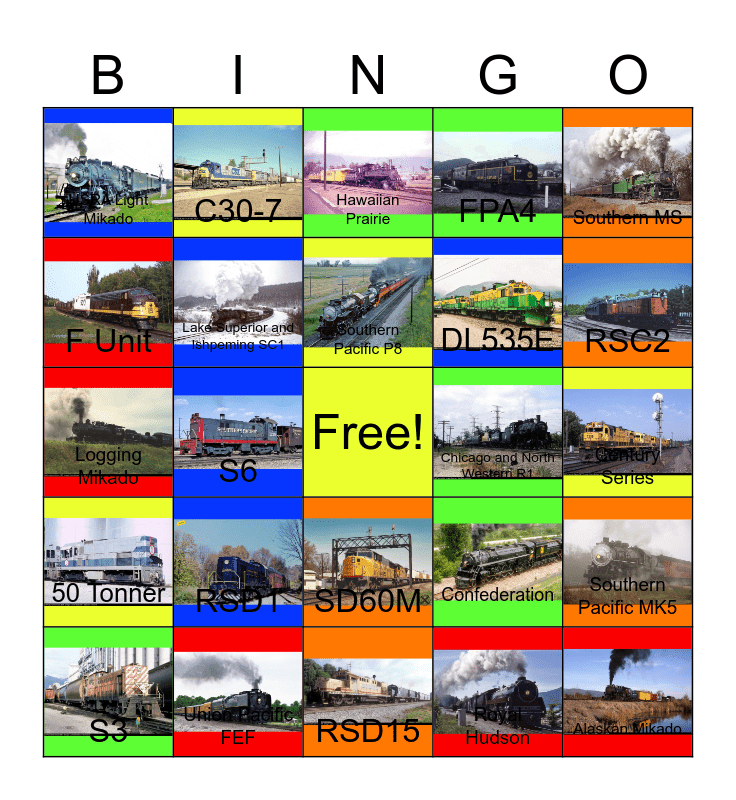 This bingo card has 24 images, a free space and 24 words: RSD1, Union Pacific FEF, Southern Pacific P8, S3, Southern MS, USRA Light Mikado, F Unit, C30-7, Chicago and North Western R1, SD60M, DL535E, Logging Mikado, Confederation, Southern Pacific MK5, Lake Superior and Ishpeming SC1, Royal Hudson, Century Series, Hawaiian Prairie, RSC2, S6, Alaskan Mikado, 50 Tonner, FPA4 and RSD15.