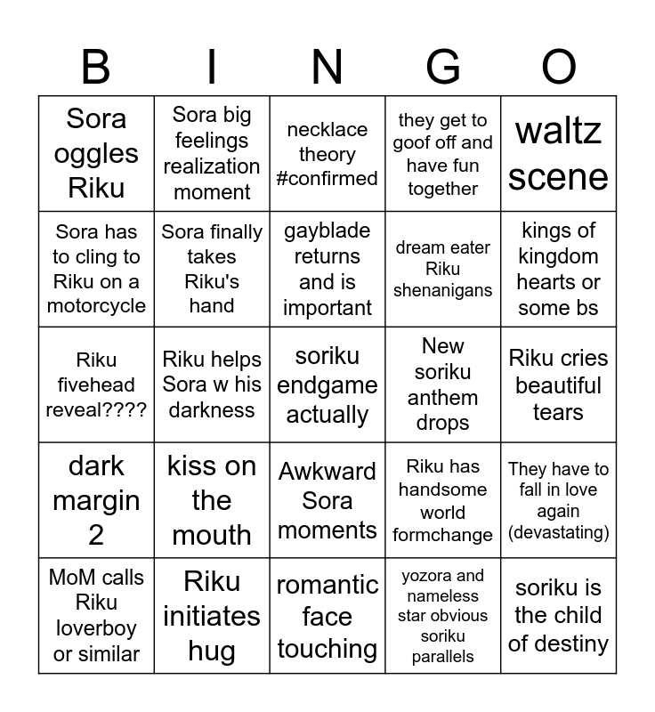 This bingo card has a free space and 24 words: kiss on the mouth, Riku initiates hug, gayblade returns and is important, MoM calls Riku loverboy or similar, waltz scene, Sora oggles Riku, Sora has to cling to Riku on a motorcycle, Sora big feelings realization moment, New soriku anthem drops, Awkward Sora moments, dream eater Riku shenanigans, Riku fivehead reveal????, Riku has handsome world formchange, They have to fall in love again (devastating), Sora finally takes Riku's hand, yozora and nameless star obvious soriku parallels, Riku cries beautiful tears, necklace theory #confirmed, kings of kingdom hearts or some bs, Riku helps Sora w his darkness, soriku is the child of destiny, dark margin 2, they get to goof off and have fun together and romantic face touching.