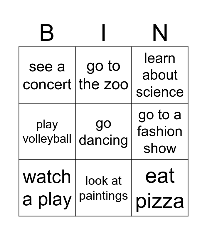 This bingo card has 12 words: buy clothes, eat pizza, go dancing, go to a fashion show, go to the zoo, learn about science, look at paintings, see a basketball game, see a concert, play volleyball, watch a play and watch scary movies.